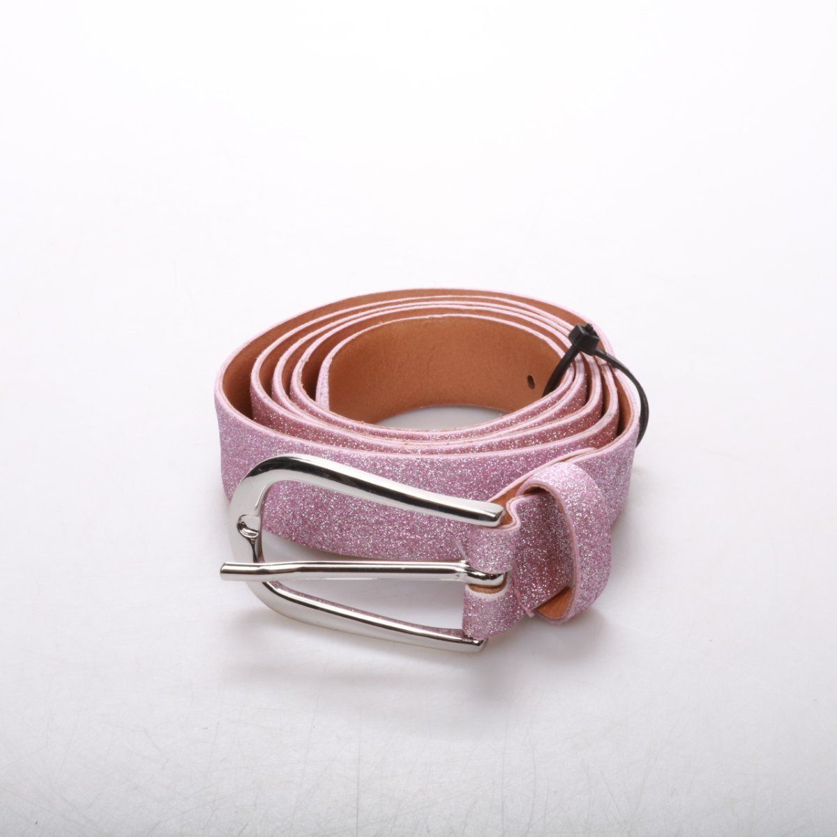Розовый ремень с блёстками и серебристой металлической пряжкой. Подойдёт для джинсов, брюк или платьев, когда хочется добавить образу яркий акцент. Удобно регулируется за счёт классической застёжки с отверстиями.