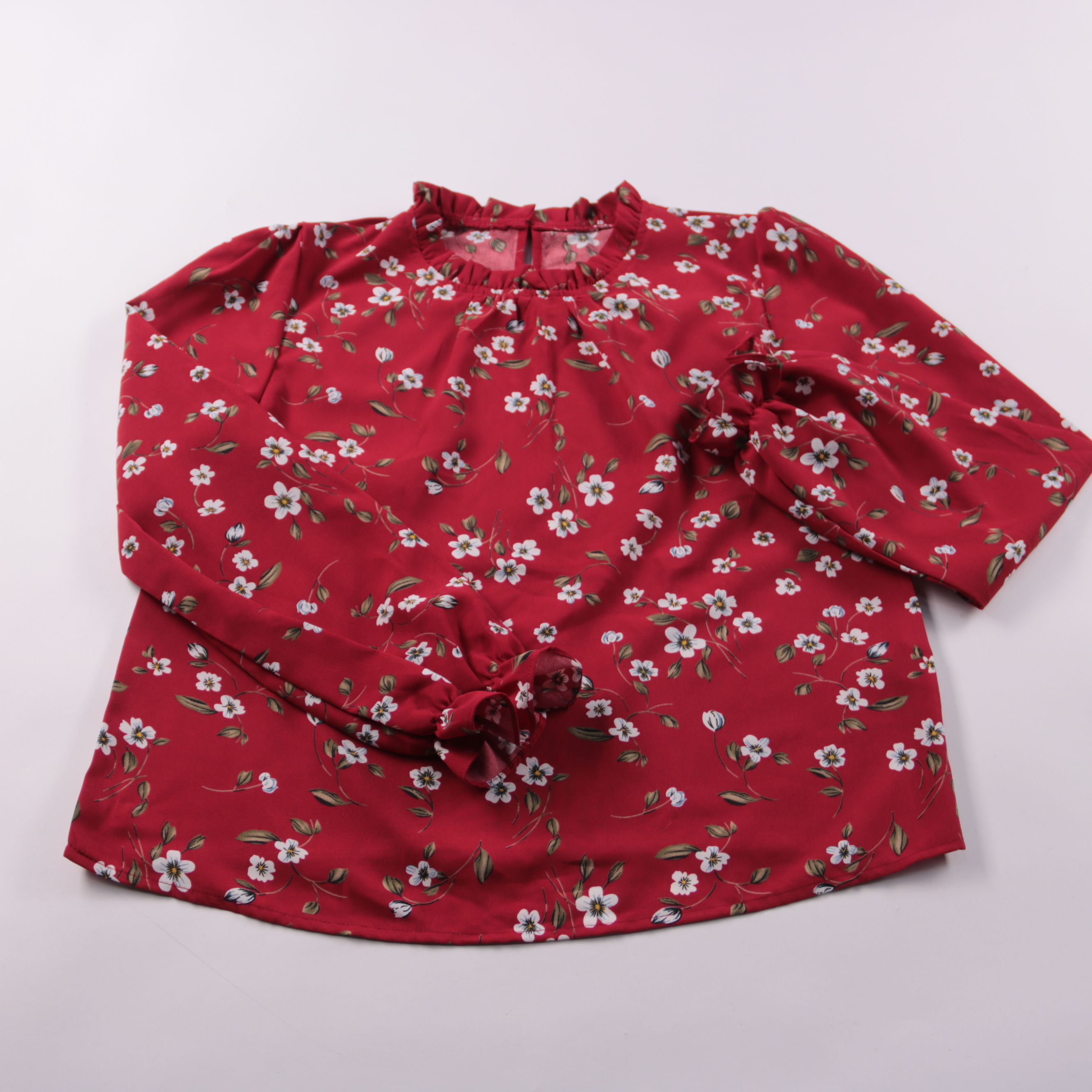 Блузка Shein красного цвета с мелким цветочным принтом, с рюшами у горловины и бантиками на манжетах. Подойдёт для школы, праздника или повседневных образов с юбкой и джинсами. Ткань лёгкая и быстро сохнет после стирки.