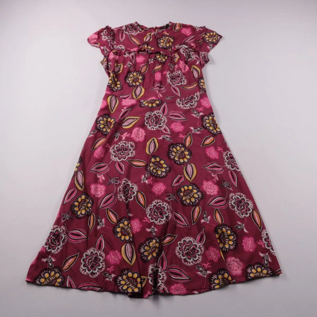 Детское платье с короткими рукавами-крылышками и цветочным принтом на бордовом фоне. Подойдёт для летних прогулок и праздничных выходов, силуэт свободный. Лёгкая ткань и пояс помогают удобно посадить по талии.