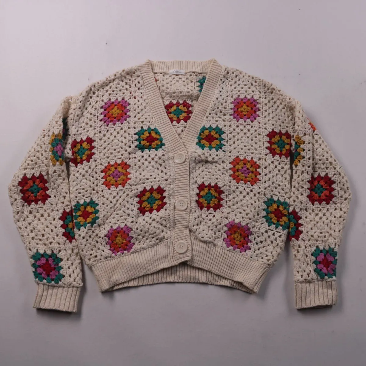 Вязаный кардиган Next кремового цвета с разноцветными цветочными мотивами и застёжкой на пуговицы. Подойдёт для школы и прогулок в прохладную погоду, можно носить поверх футболки или платья. Хлопковая пряжа приятна к телу и хорошо дышит.