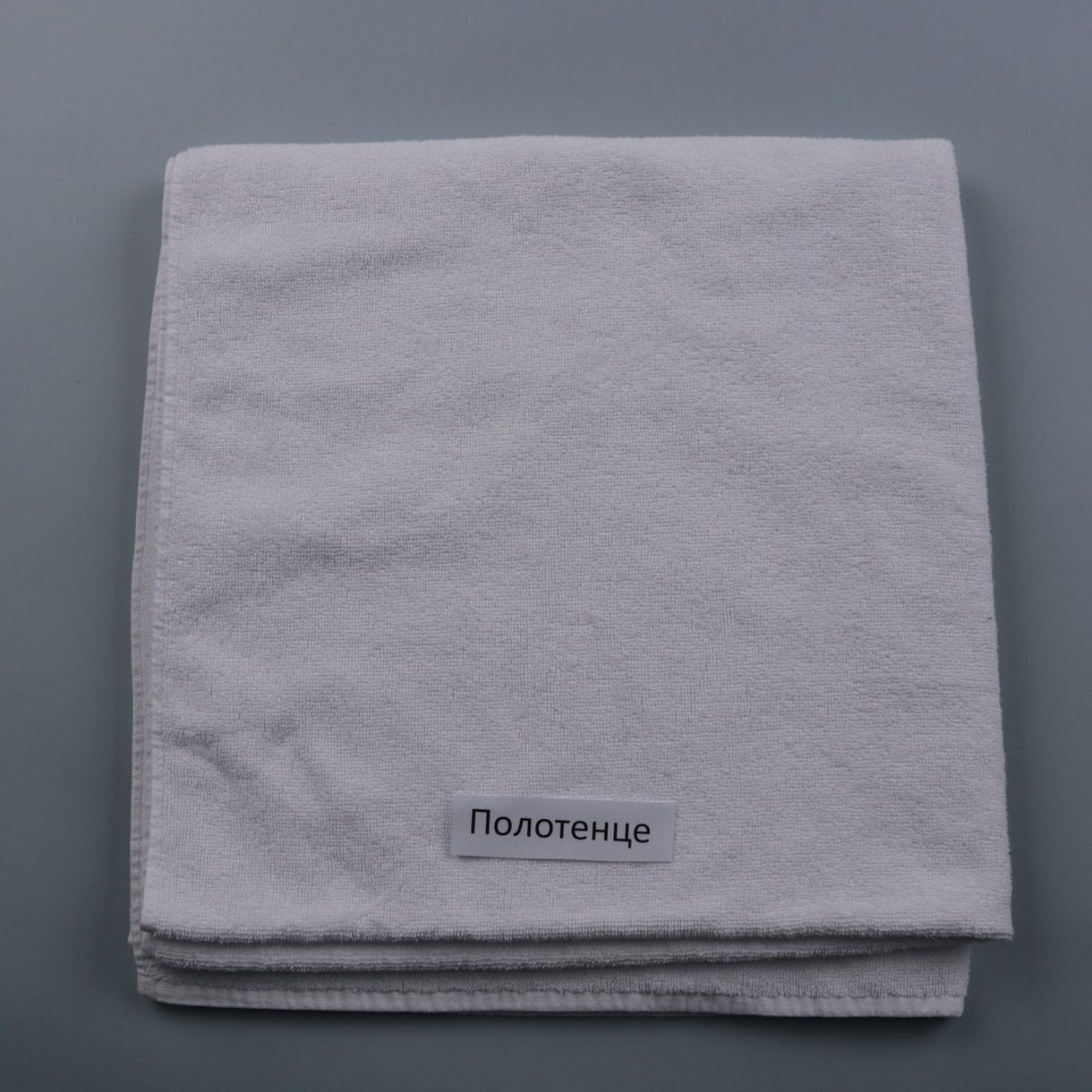 Белое махровое полотенце без указания бренда, мягкое на ощупь и хорошо впитывает влагу. Подойдёт для ванной, бани или спортзала, удобно для повседневного использования. Легко стирается и быстро сохнет.