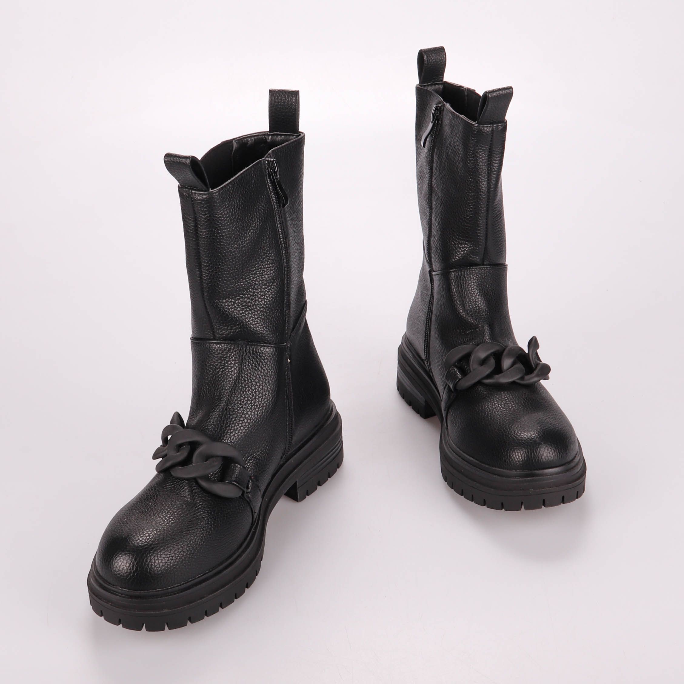Женские ботинки из чёрного зернистого материала на массивной тракторной подошве, с декоративной цепью спереди. Удобны на каждый день в прохладную погоду и хорошо сочетаются с джинсами, платьями и пальто. Плотная подошва даёт устойчивость и лучше держит...