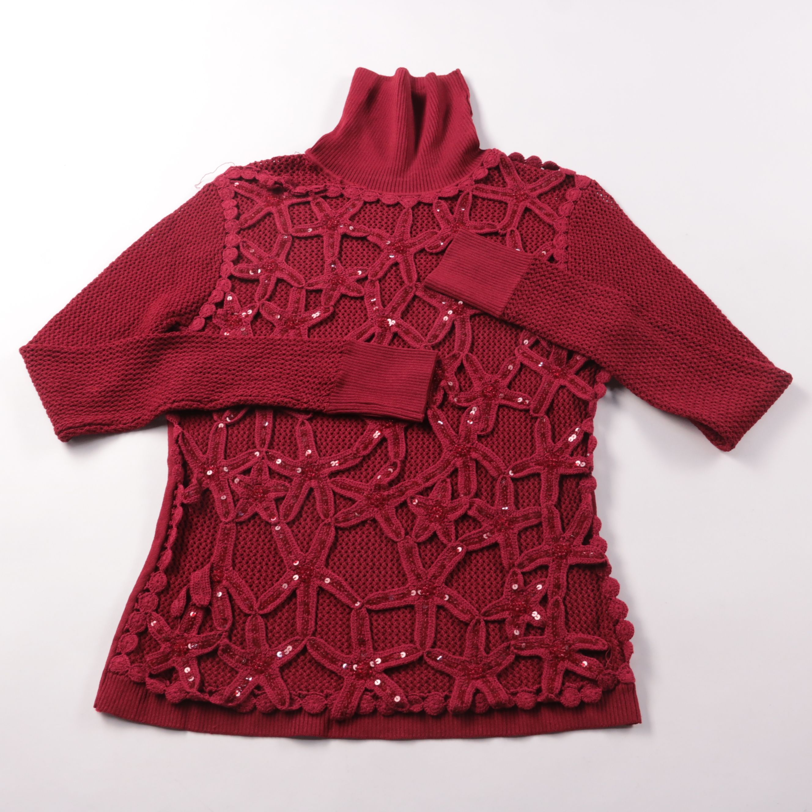 Женская вязаная водолазка с декоративным ажурным верхним слоем и пайетками. Подойдёт для прохладной погоды и образов на выход или на каждый день. Эластичный материал хорошо тянется и комфортно садится по фигуре.