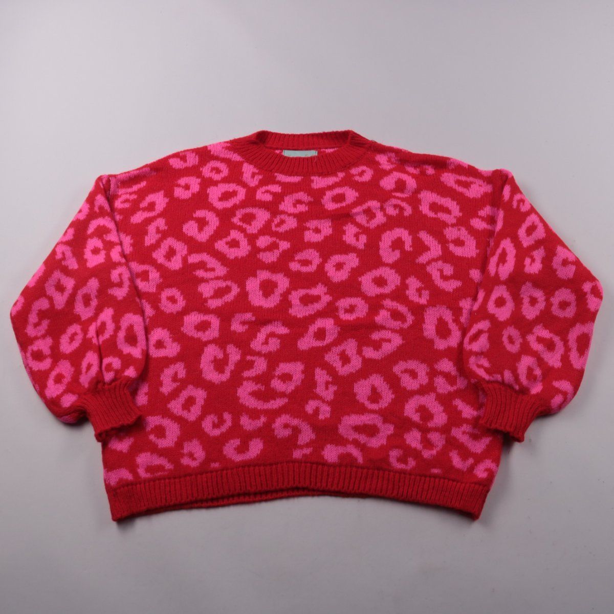 Вязаный свитер с леопардовым узором в красно-розовой гамме, без застёжек, с круглым вырезом. Подойдёт для повседневных образов в прохладную погоду и удобно сочетается с джинсами или юбкой. Смесь шерсти и альпаки в составе добавляет тепла при носке.