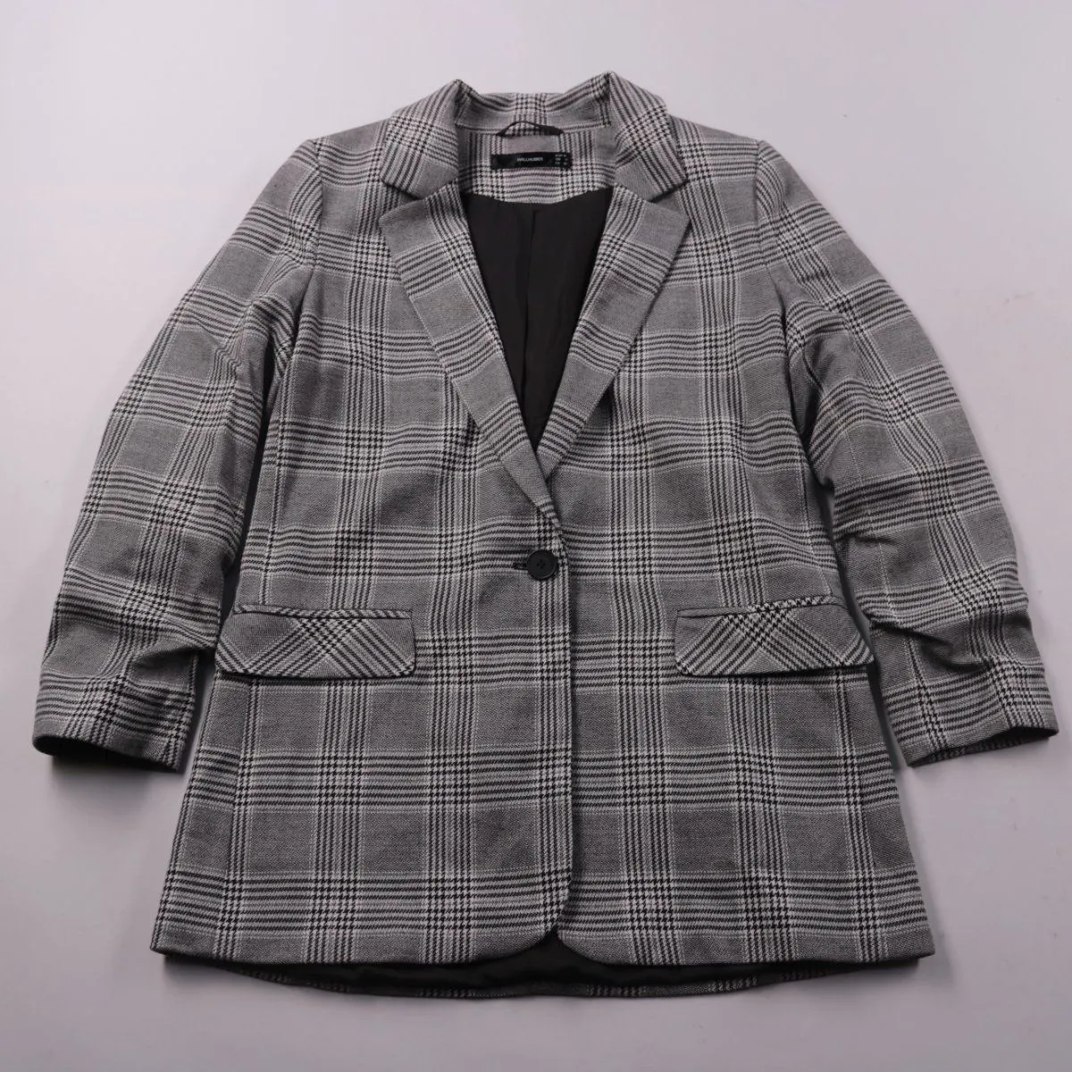 Женский пиджак HALLHUBER в серую клетку, однобортный на одну пуговицу с карманами. Подойдёт для офиса и повседневных образов в демисезон и круглый год в помещении. Ткань с добавлением эластана комфортнее садится и меньше сковывает движения.