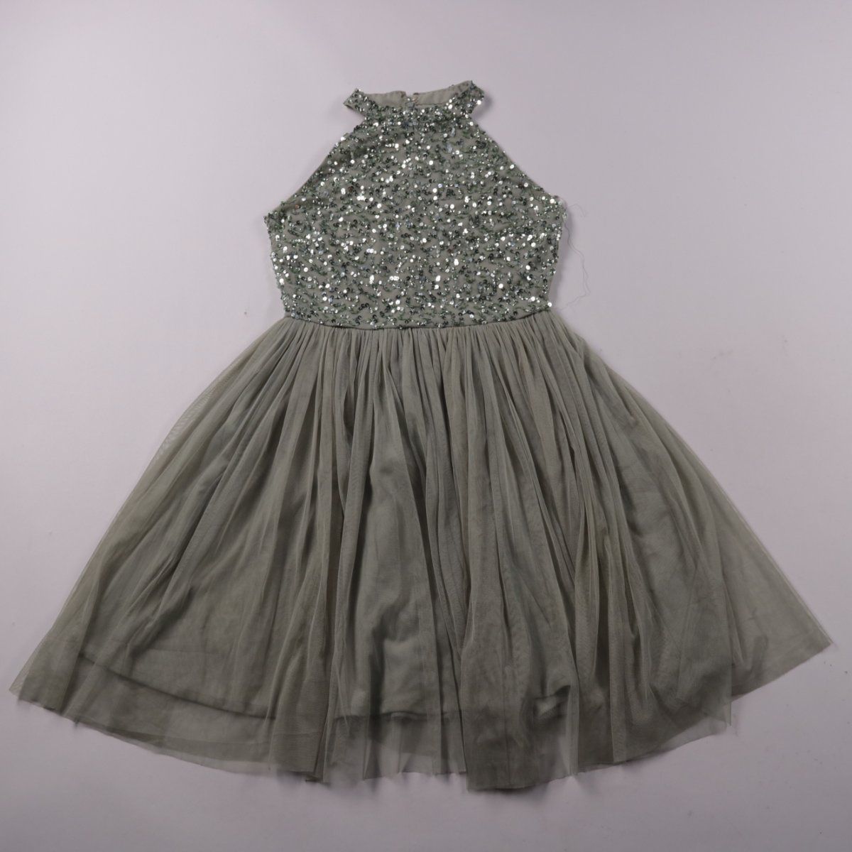 Вечернее платье Quiz с верхом, полностью расшитым пайетками, и пышной юбкой из сетки. Подойдёт для вечеринки, коктейльного выхода или торжества благодаря акцентному блеску и силуэту. Практично тем, что лёгкое и не мнётся, быстро сохнет после деликатной стирки.