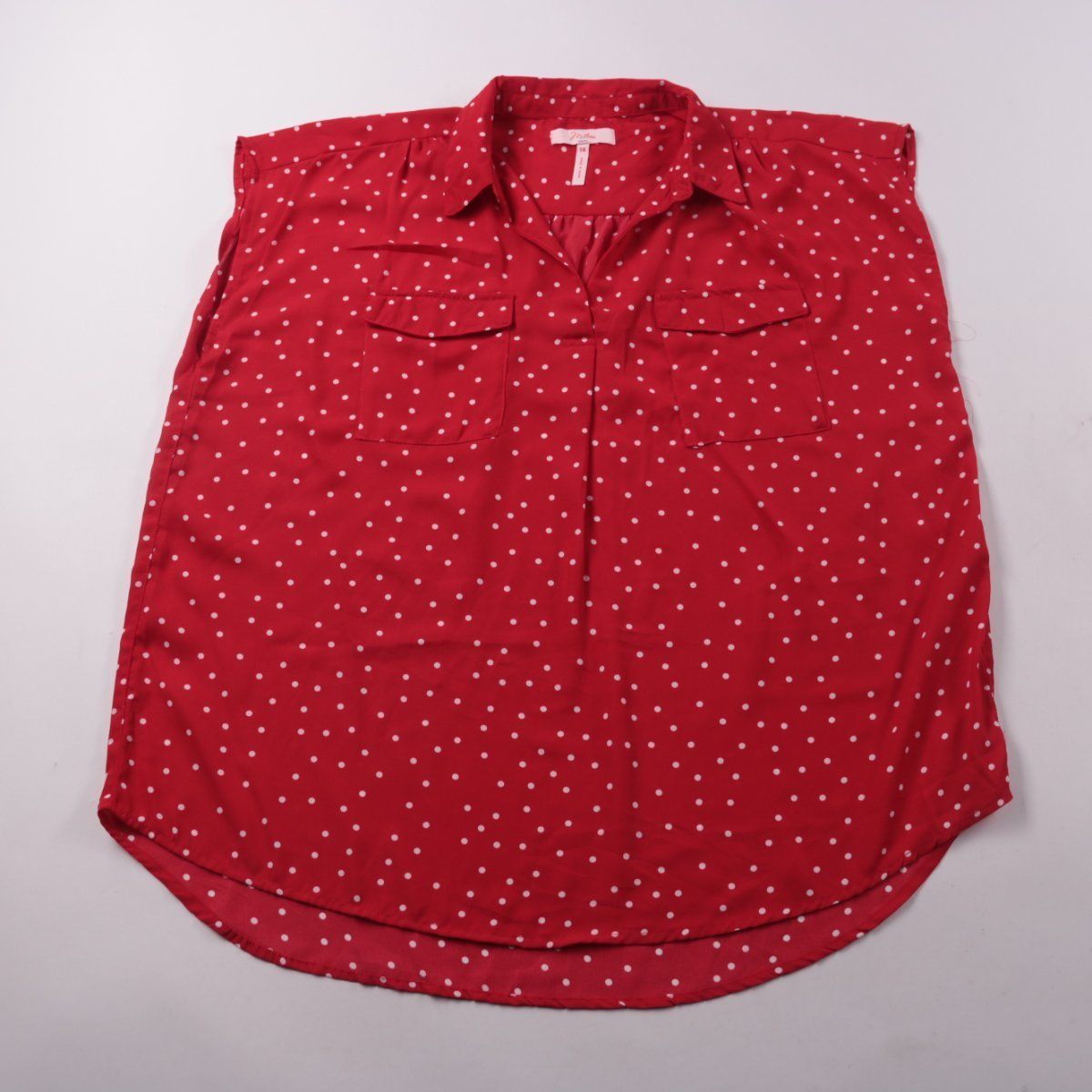 Блузка Millers без рукавов из лёгкого полиэстера, красная в белый горошек, с отложным воротником и нагрудными карманами. Подойдёт для лета и тёплой погоды, можно носить с джинсами или юбкой. Материал почти не мнётся и быстро сохнет.