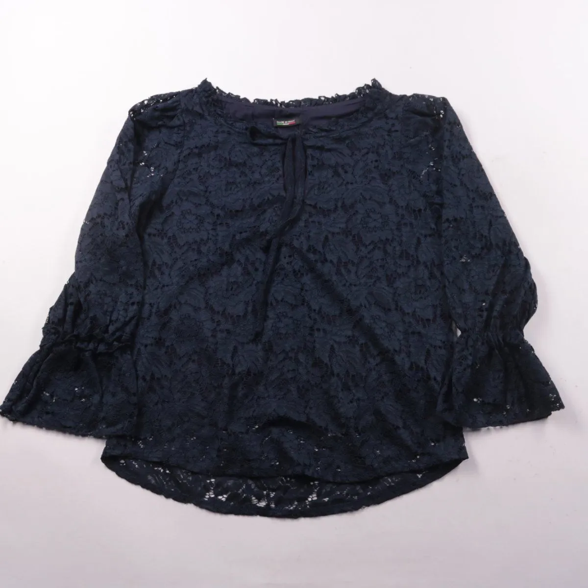 Женская кружевная блузка с завязкой у горловины и длинным рукавом с расклешённой манжетой. Подойдёт для повседневных и вечерних образов с юбкой или брюками. За счёт эластана в составе ткань немного тянется и комфортнее садится по фигуре.