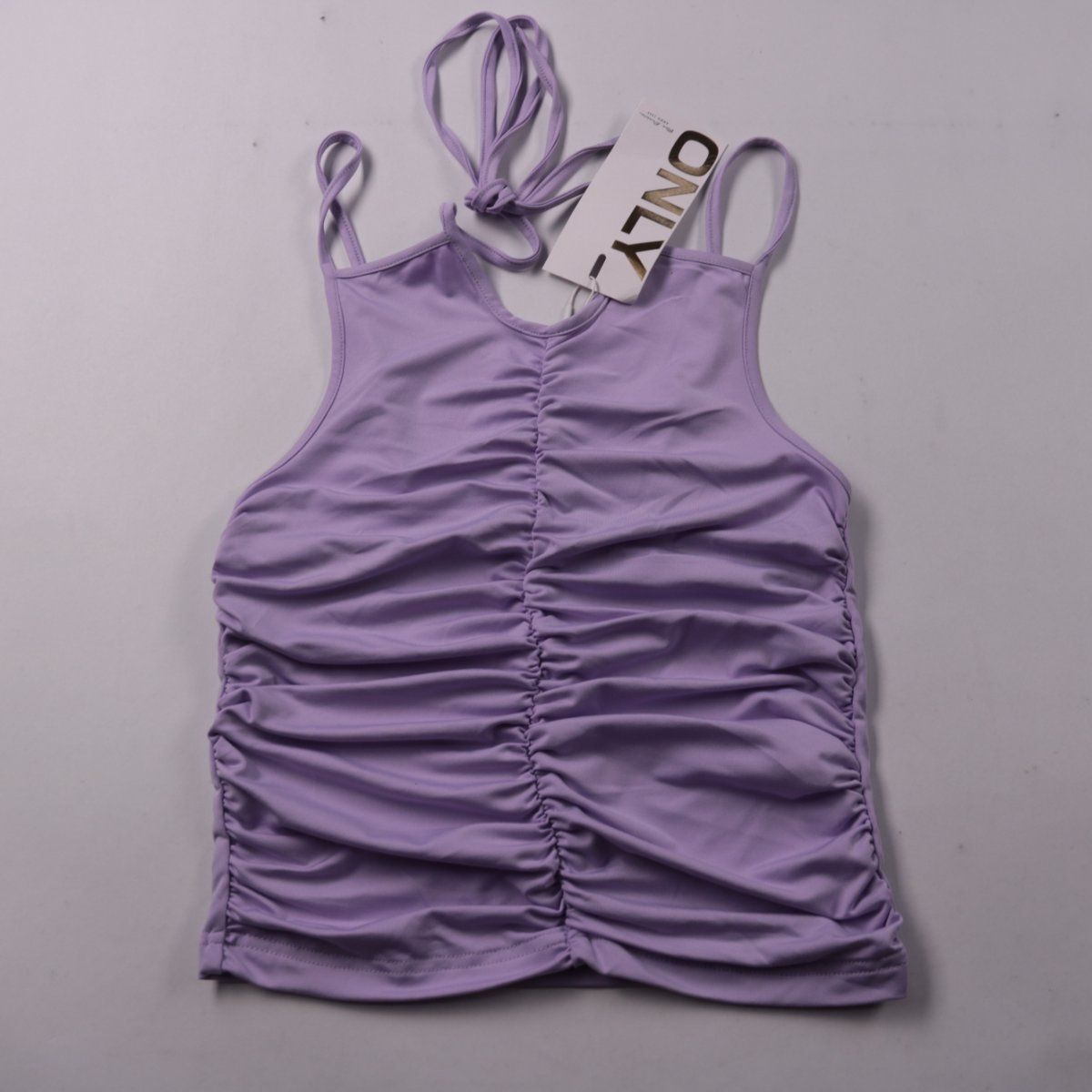Женский топ Only в цвете Purple Rose с тонкими бретелями и завязками. Модель со сборкой (драпировкой) по центру хорошо садится по фигуре и подойдёт для лета, отпуска и повседневных образов. Эластичный материал комфортно тянется и не сковывает движения.