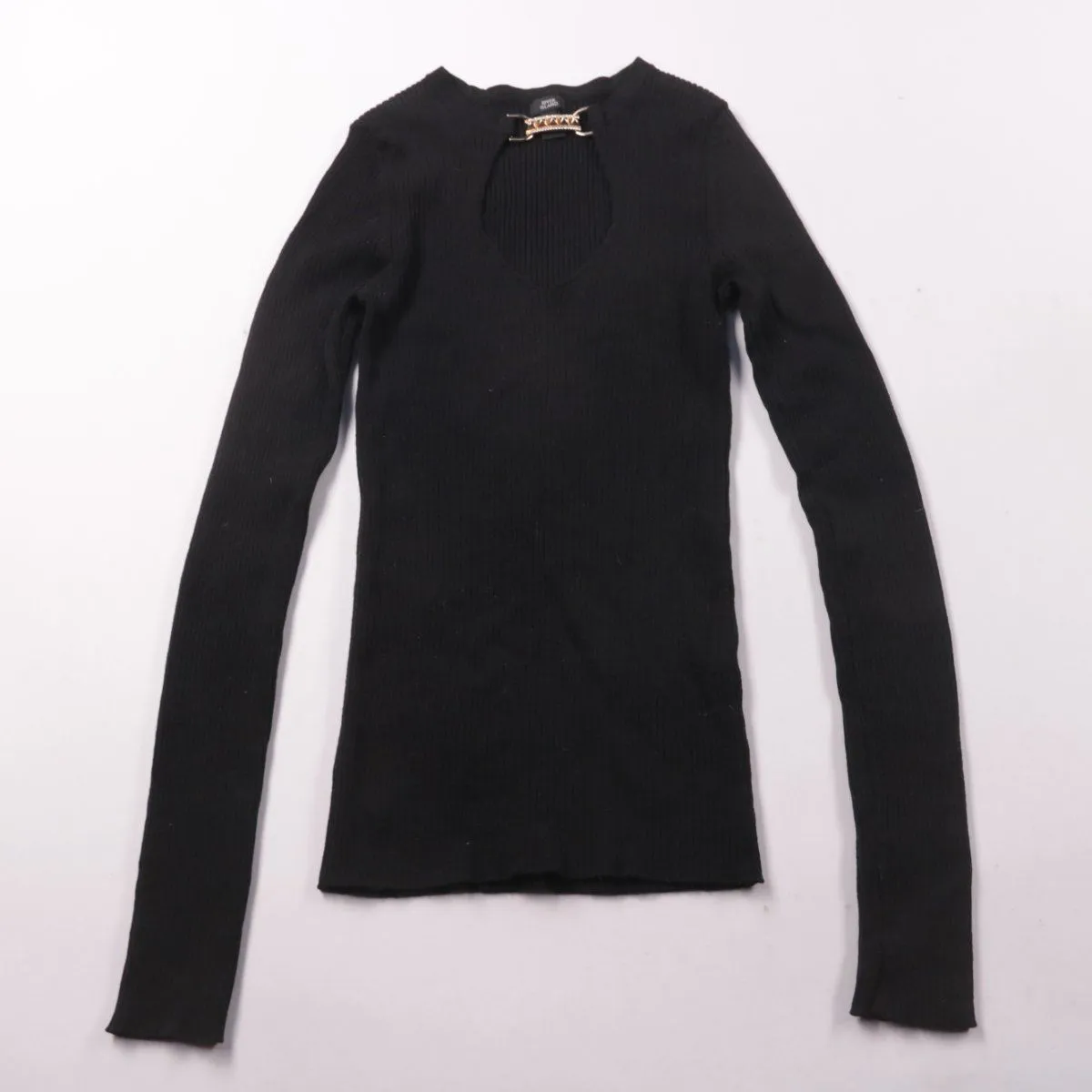 Женский чёрный лонгслив в рубчик с фигурным вырезом и декоративной перемычкой у горловины. Подойдёт для повседневных образов и на выход, хорошо смотрится как с джинсами, так и с юбками. Длинные рукава и фактурная ткань делают его удобным для прохладной погоды.