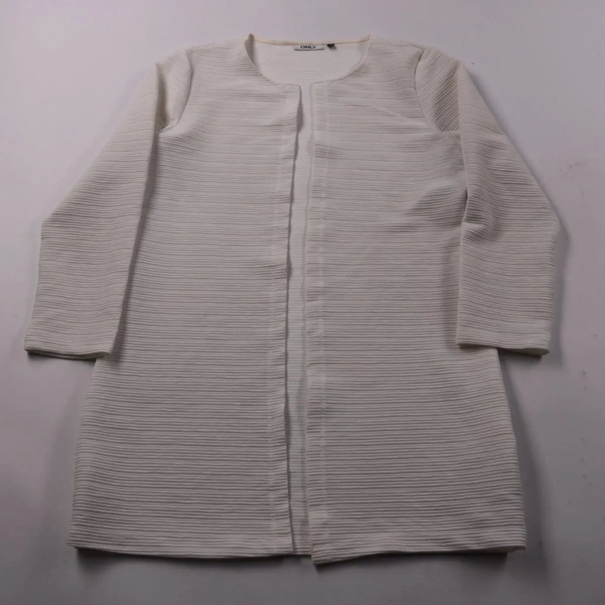 Пальто Only молочного оттенка из фактурного материала, без воротника и с открытой застёжкой. Подойдёт для демисезона и для образов в офисном или повседневном стиле. Легко комбинируется с базовыми вещами и не утяжеляет силуэт.